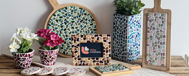 Die Mosaik-Pakete von Little Creations eignen sich ideal für Anfänger*innen und erfahrene Kreative gleichermaßen. Mit diesen Sets könnt ihr bunte und persönliche Wohnaccessoires gestalten, wie z. B. ein Servierbrett, Tablett oder Blumentopf, ganz nach eurem eigenen Stil. Ideal als JGA kreativ Workshop, um gemeinsam kreativ zu sein und besondere Erinnerungen zu schaffen.