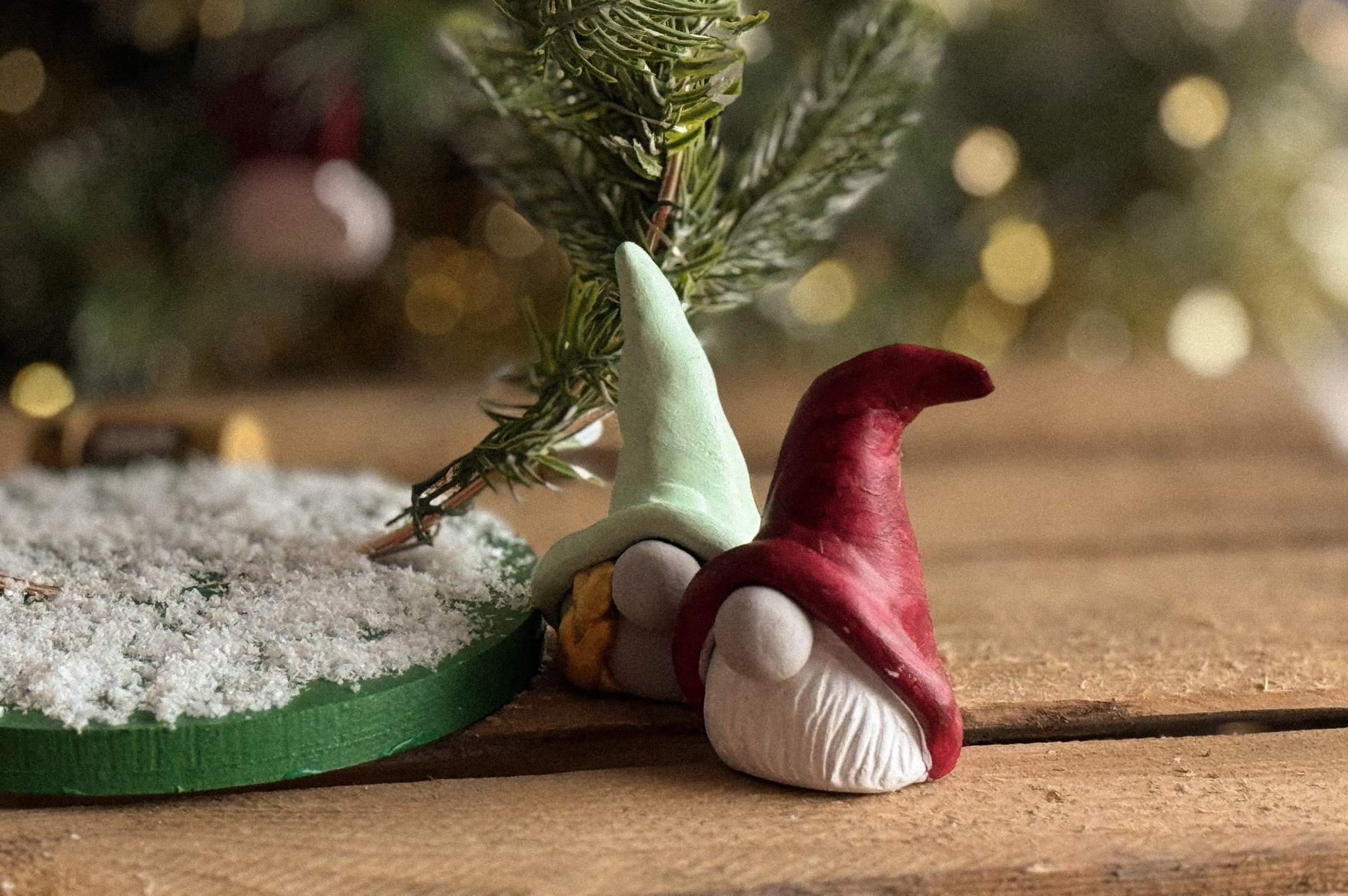 Der Metallring wird mit künstlichen Tannenzweigen, stimmungsvollen LED-Lichtern und zwei niedlichen Gnomen aus lufttrocknender Modelliermasse dekoriert. Perfekt für alle, die gerne einen Gnom mit Licht oder einen Gnom aus Ton basteln und ihre kreative Seite ausleben möchten.